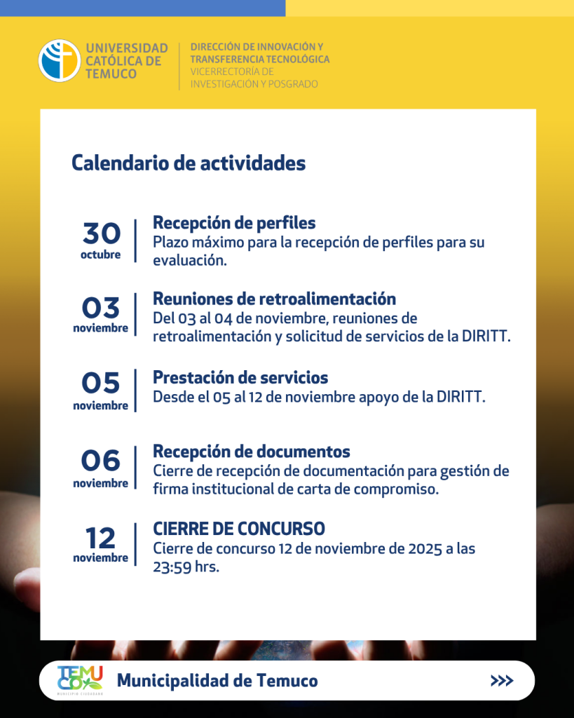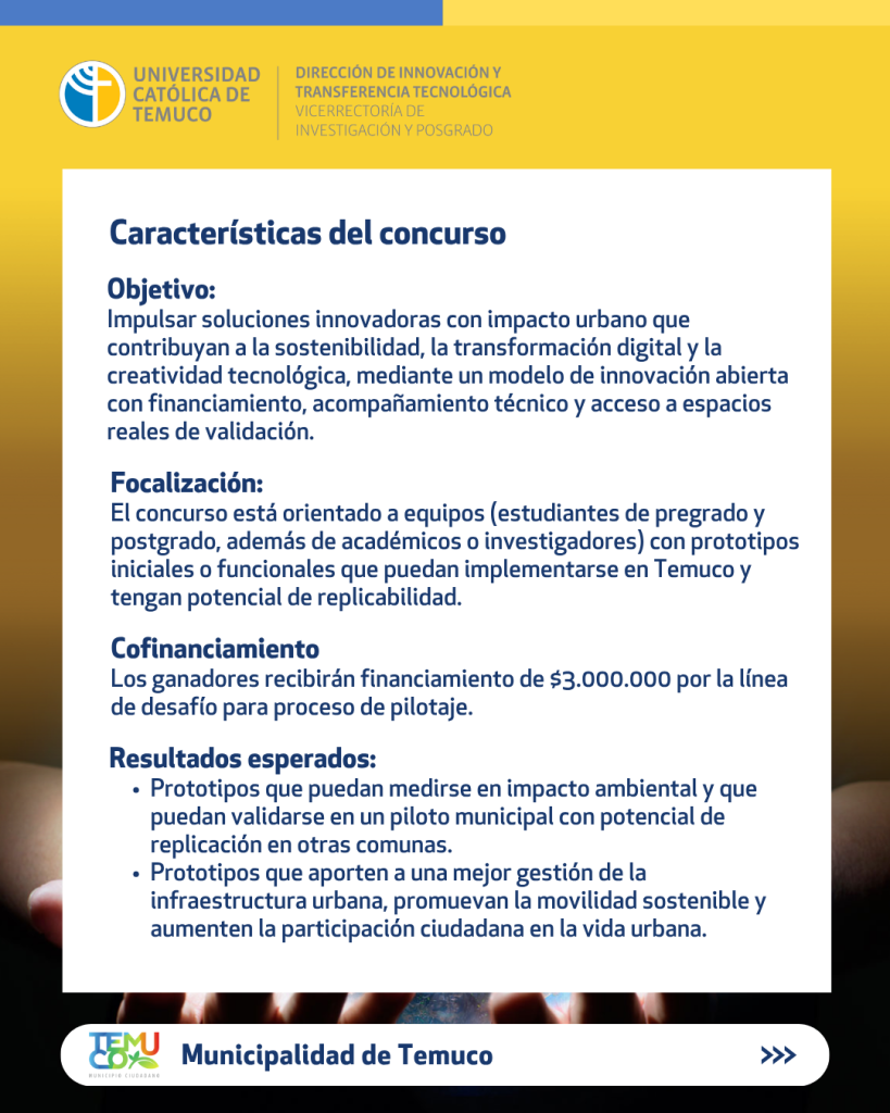 La Dirección de Innovación y Transferencia Tecnológica (DIRITT) invita a participar en el concurso de innovación abierta Smart Temuco 2025 de la Municipalidad de Temuco y Temuco Lab.